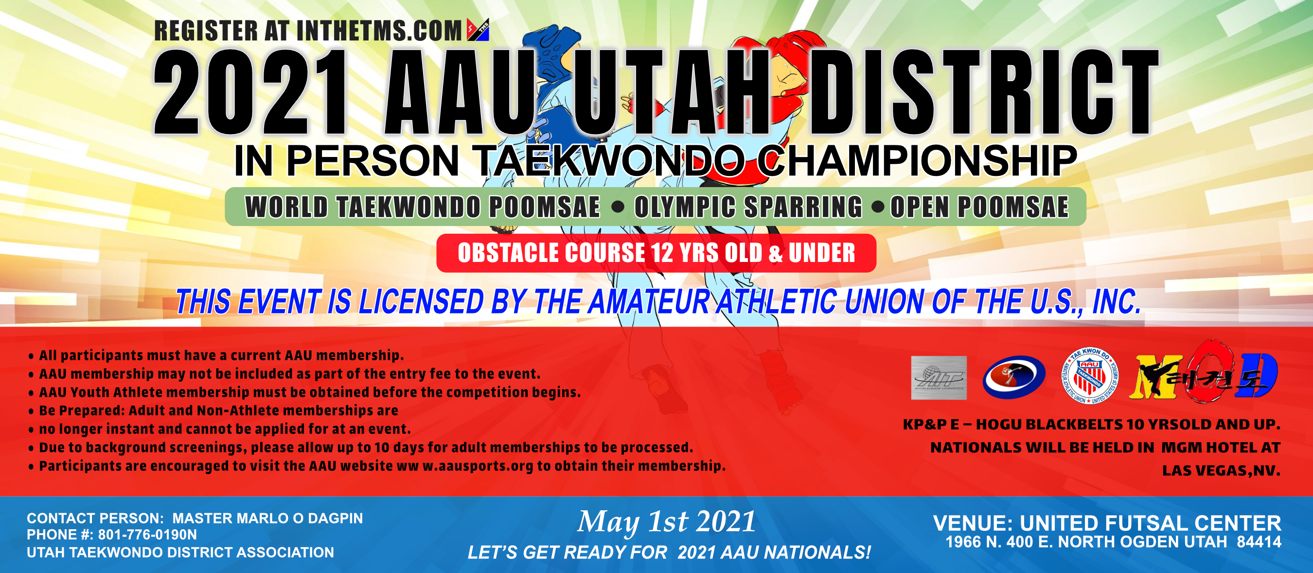 Great news! Late registration deadline has been extended to April 30. See you all on May 1st!. To participate in this event all Athletes and Coaches must have an active AAU membership. Go to aautaekwondo.org to obtain membership.