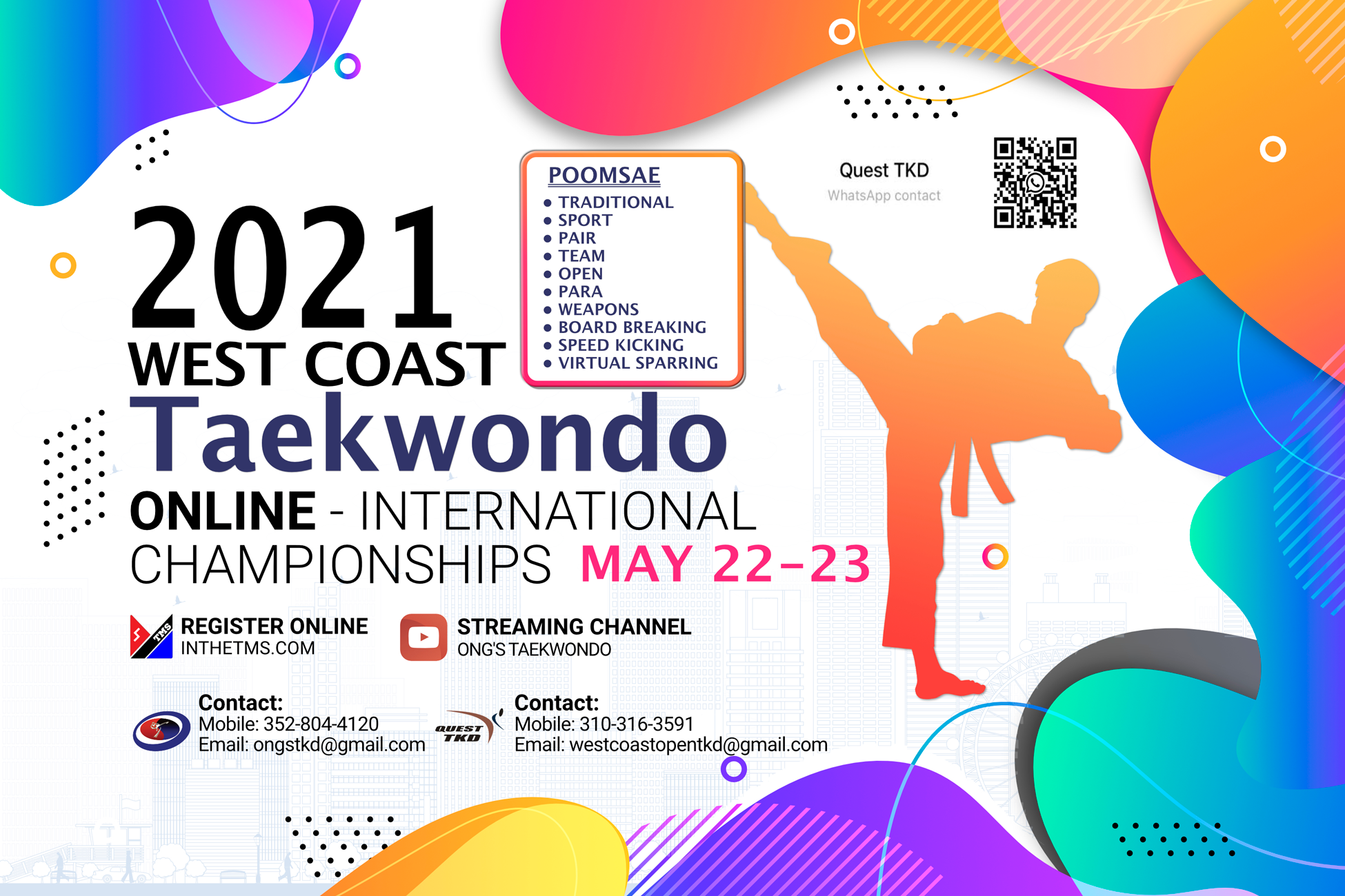 Schedule for 2021 West Coast Taekwondo Online Championships is now available in the inthetms.com. Matches and time of each division may change on actual day of tournament. Good luck to all the athletes, coaches and teams!